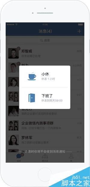 “休息一下”可以让员工进入工作免打扰模式,在休息期间不接收工作消息,帮助员工区分工作和生活。