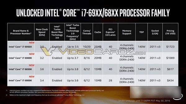 新款Broadwell-E处理器参数