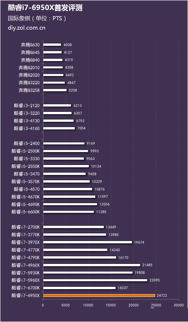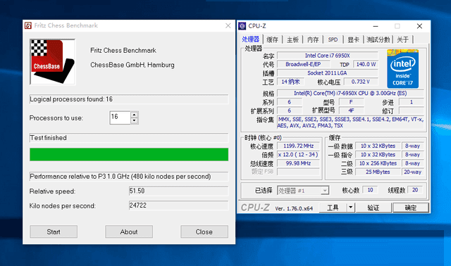 在国际象棋的测试中,由于软件只能识别出处理器的16个线程,相当于i7-6950X有四个线程并没有在测试中工作,因此相比上代产品的提升并不如wPrime来的明显。但1000多分的分数差距足以证明新款处理器具备了更好的运行效率。