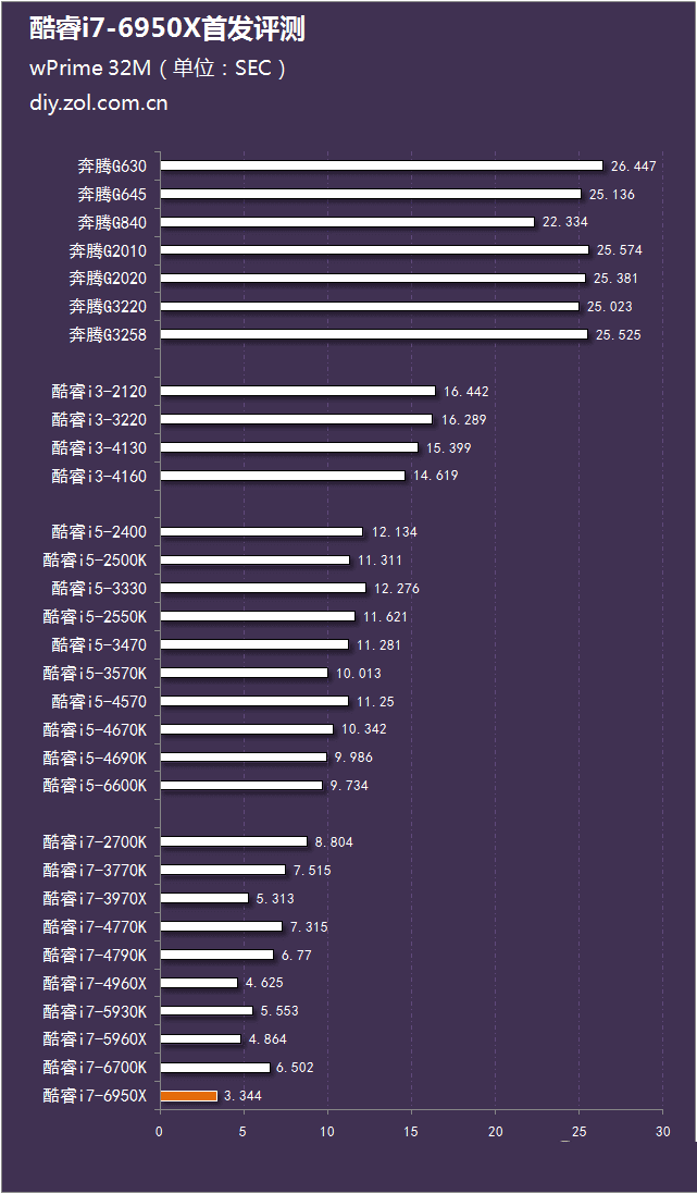 进入了多核心性能测试部分,十核心二十线程的i7-6950X如鱼得水,能够充分发挥其多核心、多线程的优势。在wPrime32M的测试中,i7-6950X在速度上领先上代旗舰i7-5960X超过了1.5秒,对于一项不足5秒的测试来说,1.5秒的速度提升是非常巨大的。