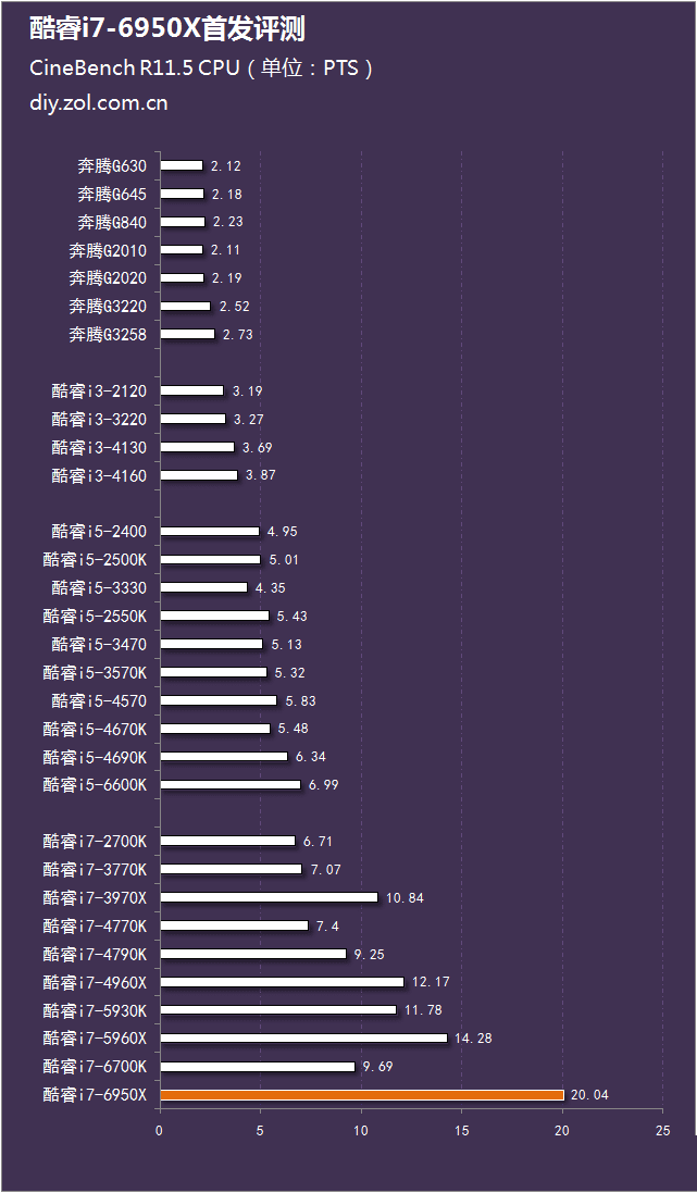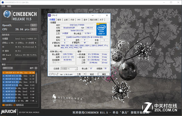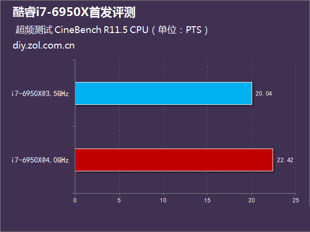 在CineBench的测试中,i7-6950X的优势更加明显,CPU得分20.04,超过了上代旗舰i7-5960X得分的40%以上。无论是需要多线程游戏、娱乐、直播的游戏玩家,还是注重极致效率的设计师,40%的性能提升意味着能够更加高效率的完成目标工作,尤其是对于一些需要处理几个小时甚至几十个小时的大型项目来说,i7-6950X带来的效率提升堪称质的飞跃。