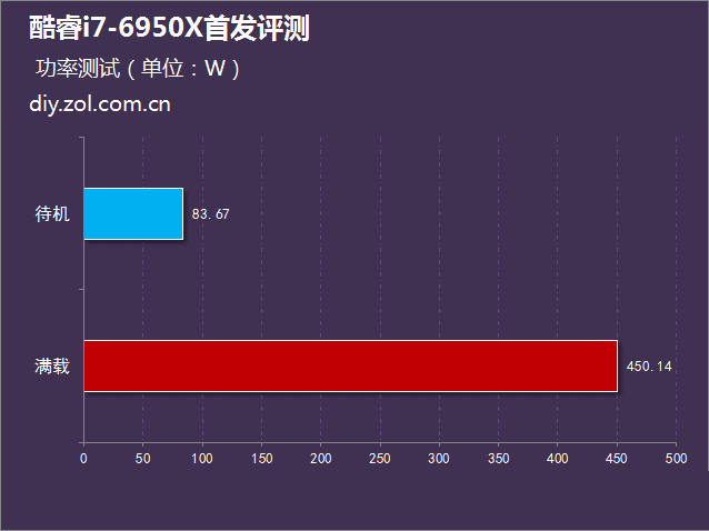 由于本次的测试平台搭配了GTX980Ti独立显卡,因此整机满载状态下的功耗不低,达到了450W左右。对于一套旗舰级平台来说,搭配一款高功率的电源也是无可厚非,相信对于绝大多数选择i7-6950X平台的用户来说,450W的功耗还是完全可以接受的。