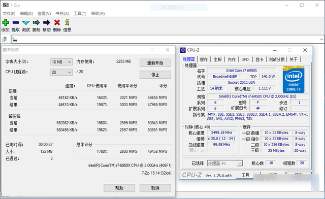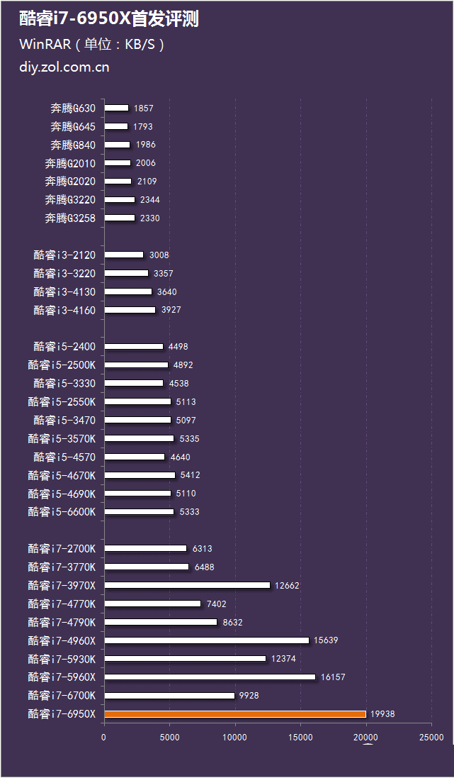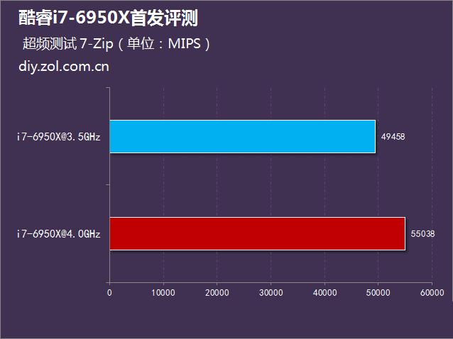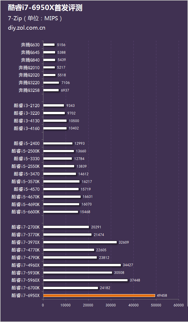与WinRAR的测试相比,7-Zip的测试结果更加明显。酷睿i7-6950X的得分遥遥领先,相比i7-5960X的效率提升了32%,总得分逼近5万大关。