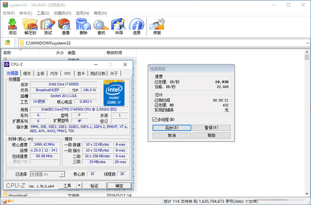 接下来是处理器压缩/解压缩能力的测试,首先使用的测试软件是WinRAR。从测试的结果上来看,新一代i7-6950X处理器的执行效率仍然大幅领先i7-5960X,相比四核i7系列产品更是有了成倍的效率提升。