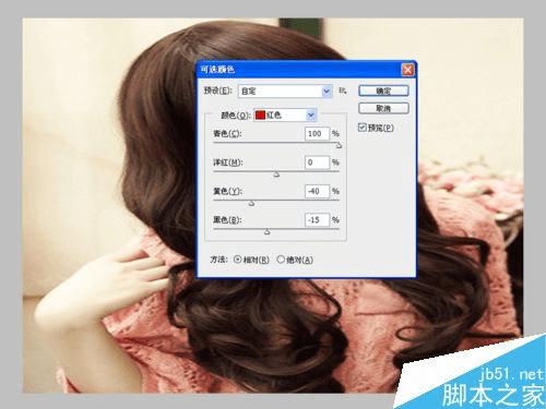 执行图像-调整-可选颜色命令,调出可选颜色对话框,在该对话框中设置颜色为红色,青色设置为100%,黄色为-40,黑色设置为-15点击确定按钮。