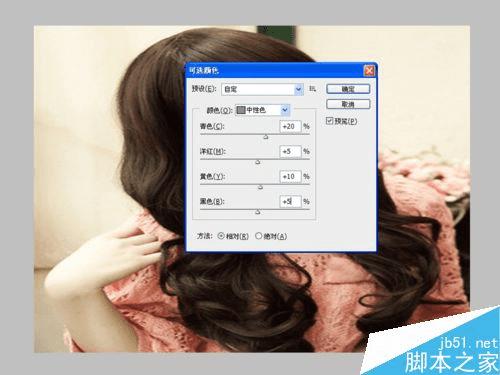 步骤三调查可选颜色对话框,在该对话框中设置颜色为黄色,接着设置青色为100,洋红为-15,黄色为-100,黑色为-20点击确定按钮,再一次调整选择颜色为中性色,青色为20,洋红为5,黄色为10,黑色为5.