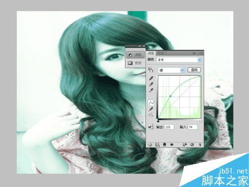 再一次点击创建新的填充或调整图层菜单,从下拉菜单中选择曲线命令,在弹出对话框中选择蓝色,调整曲线,同样方法重新选择绿色再一次进行调整。