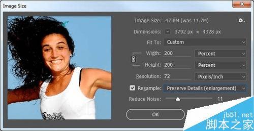 打开Photoshop,选择"图像>图像大小",设置图像各自增大200%,勾选重新取样,设置保留细节(扩大)。