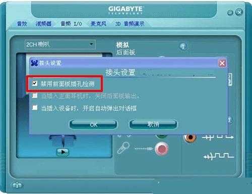在Realtek高清晰音频配置设置面板接头设置里勾选“禁用前面板插孔检测”(打上勾)即可。