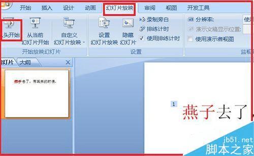 7、找到幻灯片放映,观看一下,设置后的效果,在单击时是不是自己需要的文字就改变了颜色。