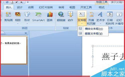 2、找到插入,单击一下,找到文本框单击一下,在文本框中输入要需要改变颜色的文字。保持和原来输入文字的字号字体。