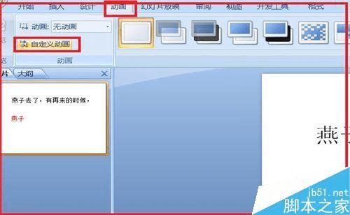 4、找到“动画”,单击一下,找到自定义动画,再单击一下。这些要在选中文字的情况下操作。