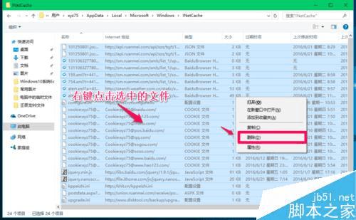 INetCache文件夹显示的都是IE临时文件,我们按下键盘上的Ctrl+A键,选中全部临时文件,右键点击,在右键菜单中点击:删除;