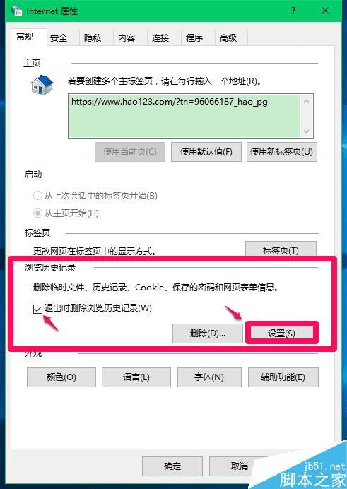 我们也可以进入【控制面板】,点击【Internet选项】,在打开的Internet 属性窗口,点击【浏览历史记录】项的【设置(S)】(在退出时删除历史记录复选框内打勾);