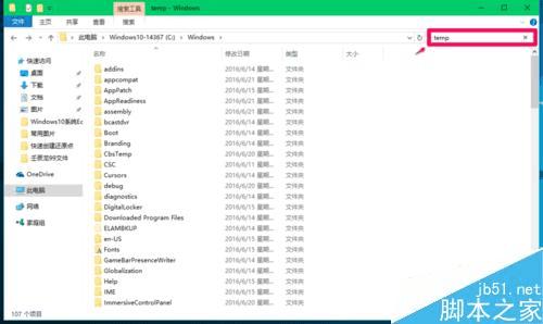 在Windows文件夹窗口右上角的搜索栏中输入:Temp;