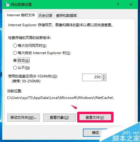在打开的网站数据设置窗口,点击【查看文件】,也可以打开INetCache文件夹(IE高速缓存临时文件夹);
