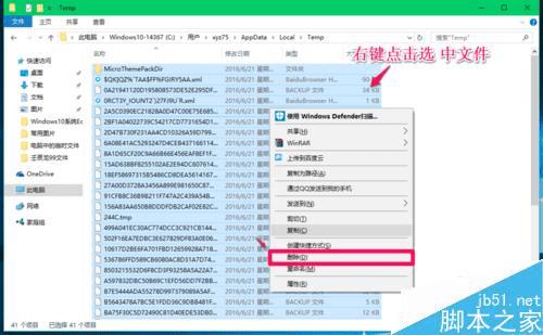 Temp文件夹显示的都是用户帐户临时文件,我们按下键盘上的Ctrl+A键,选中全部临时文件,右键点击,在右键菜单中点击:删除;