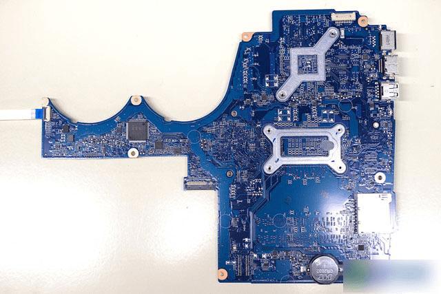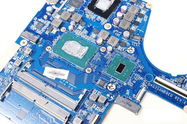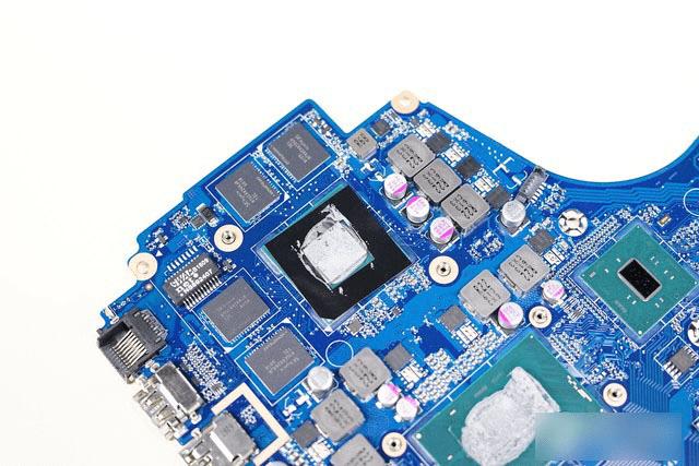 在主板左上方是NVIDIA GeForce GTX 960M独立显卡芯片,同时显存芯片颗粒以及供电电容均匀的分布在显卡芯片的周围,分布十分合理。