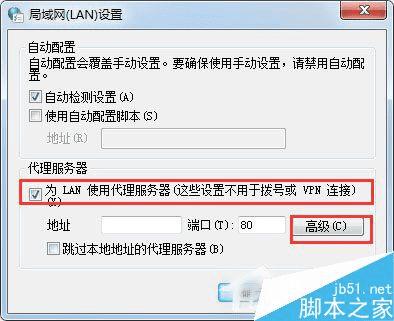 3.在弹出的“局域网(LAN)设置”对话框下,选中“为 LAN 使用代理服务器”的复选框。然后点击“高级”按钮。