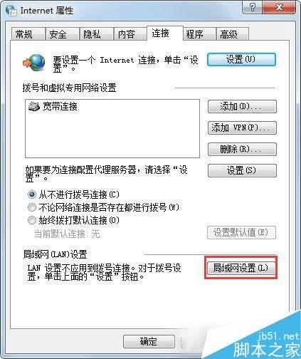 2.在“Internet 选项”对话框下,点击“连接”选项卡,然后点击“局域网设置”按钮。
