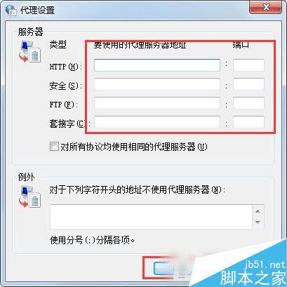 4.在弹出的“代理服务器设置”对话框下,设置不同类型的代理服务器(如 HTTP、HTTPS 或 FTP)。然后输入“要使用的代理服务器地址”,点击“确定”按钮即可。