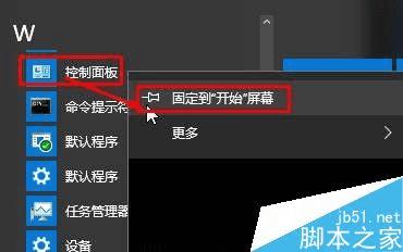 2、在“控制面板”上单击右键,选择“固定到’开始‘屏幕”;
