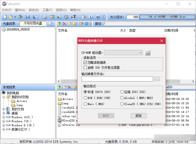 如果习惯于使用经典光驱工具软碟通(UltraISO),制作ISO也非常方便。只需将光盘放入光驱,按下F8功能键,选择光驱所在的驱动器号和ISO映像输出的路径、文件名,点击“制作”按钮即可生成光盘的ISO文件(图2)。