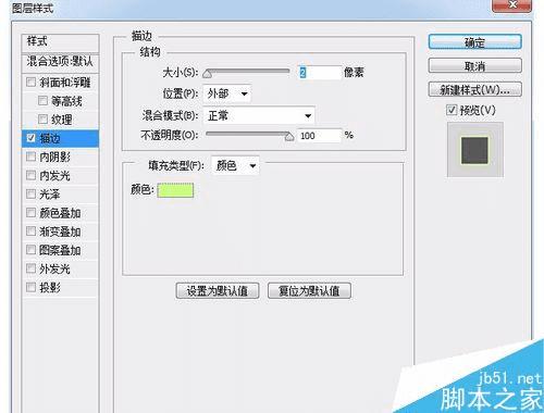 第五步我们将填充成黑色的光点层加一个描边,把前景色调成更为亮一些的黄绿色,小编的参数是#caff7f,然后我们双击图层调出样式框,选择描边,那么设置完以后,字体就完成啦!