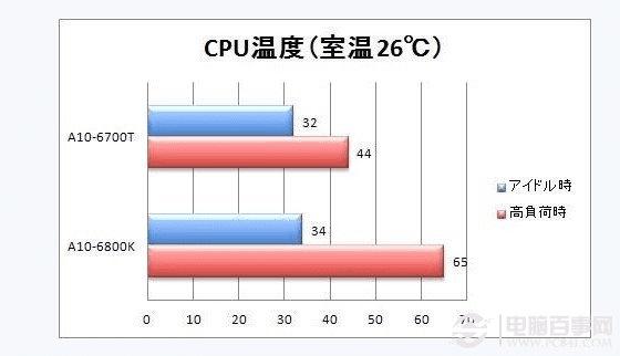 温度控制方面,A10-6700T的表现非常惊艳,其满载温度只有44度,比A10-6800K低了21度,此外待机温度也比A10-6800T低了2度。