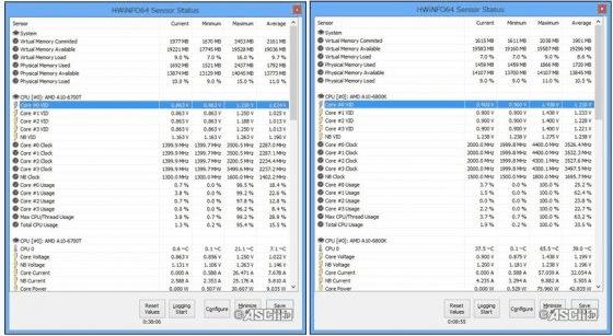 从HWiNFO的检测结果来看,A10-6700T的核心电压只有1.25V左右,而A10-6800K则达到了1.438V。