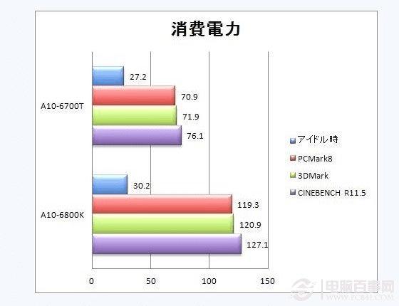 功耗测试方面,A10-6700T表现依然十分出色,其测试状态下的功耗只有70W左右,比A10-6800K低了50W。