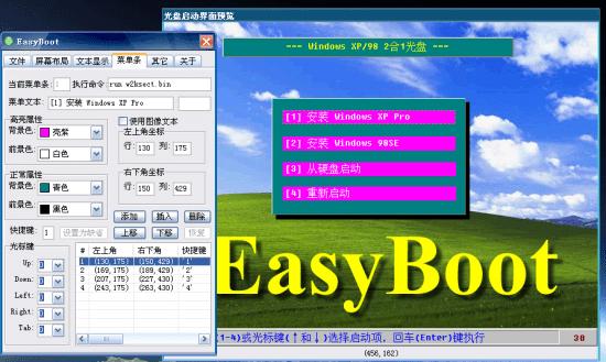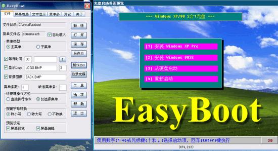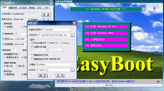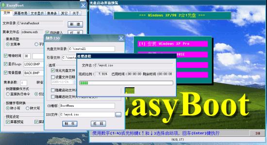 安装好 EasyBoot,把 EasyBoot/disk1/ 目录下的 ezboot 文件夹复制到 C:/install 下。打开 ezboot 文件夹,删除 bcdw.bin ebback.bmp eblogo.bmp standard.ctb default.ezb bcdw.txt 这几个文件。用记事本打开 w2ksect.bin 同样把 "i386" 字节替换为 "BOOT" 然后保存。logo.bmp 和 BACK.BMP 是 EasyBoot 的默认 logo 和背景图片,(实在难看),我们可以用 PhotoShop 自己制作(方法见图片附件),然后保存。打开 cdmenu.ezb 单击"制作ISO"制作光盘镜像。