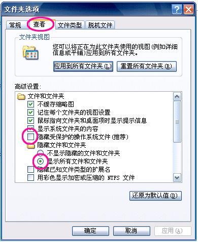 开始之前我们做些准备工作,单击"工具"-->"文件夹选项"在"查看"中选择"显示所有的隐藏文件和文件夹",不选择"隐藏受保护的系统文件"。