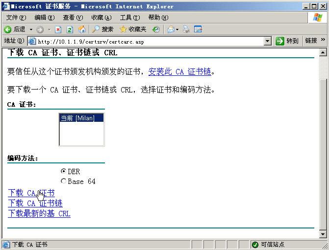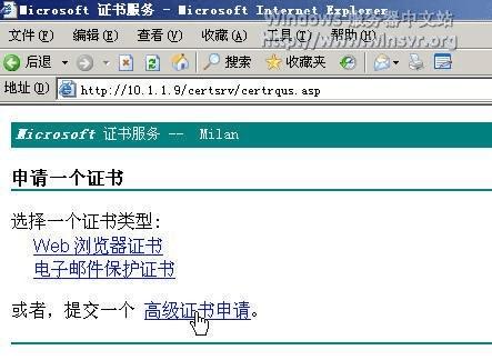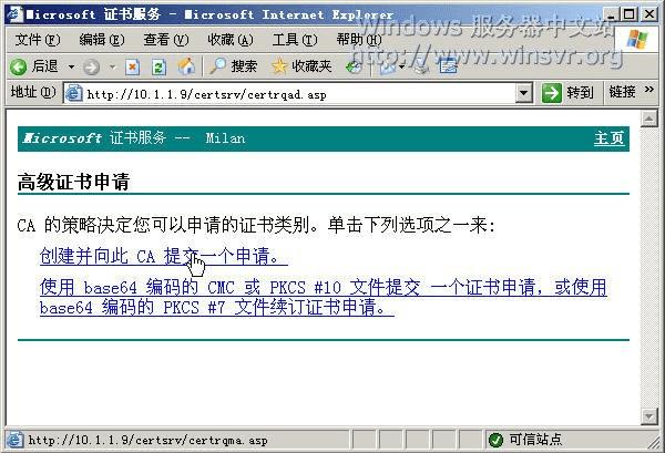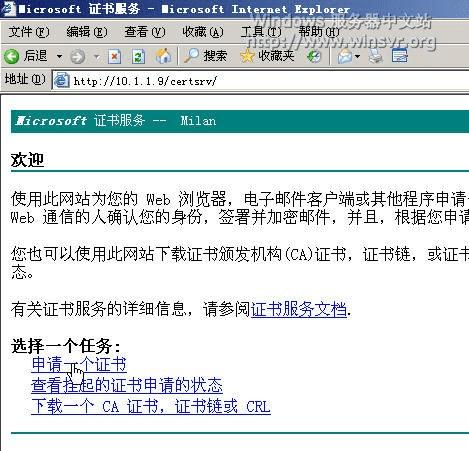 然后,在VPN服务器Munich上打开浏览器,访问证书服务器Milan的Web注册登录地址http://10.1.1.9/certsrv/,如下图所示,点击申请一个证书链接;