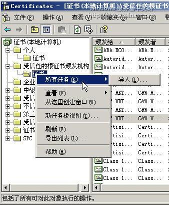 打开创建的计算机证书管理控制台,然后展开受信任的根证书颁发机构,右击证书,点击所有任务下的导入,