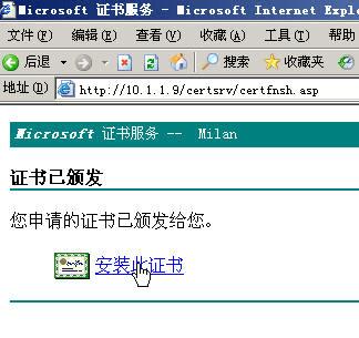 在弹出的警告提示框上点击是,然后在证书已颁发页,点击安装此证书(如果没有配置CA自动颁发证书则你可能需要在证书颁发机构中手动颁发证书);