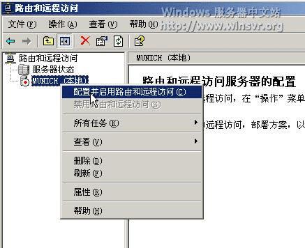 在Munich上以管理员身份登录,然后点击管理工具,选择路由和远程访问,在弹出的路由和远程访问管理控制台,右击服务器名,选择配置并启用路由和远程访问;