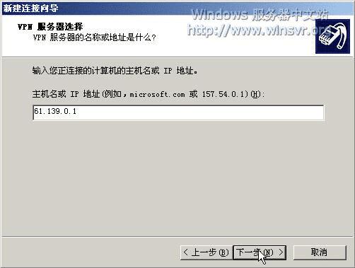 在VPN服务器选择页,输入VPN服务器Munich的外部IP地址61.139.0.1,然后点击下一步;