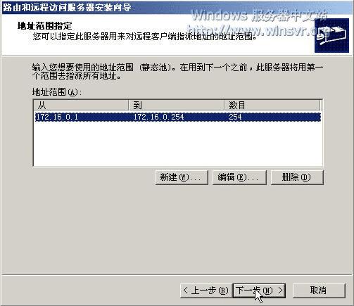 在地址范围指定页,点击新建按钮,输入起止IP地址分别为172.16.0.1和172.16.0.254,然后点击确定,完成后如下图所示,点击下一步;