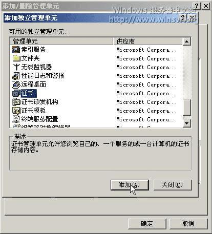 在弹出的添加/删除管理单元对话框,点击添加;然后在弹出的添加独立管理单元对话框,选择证书,点击添加;