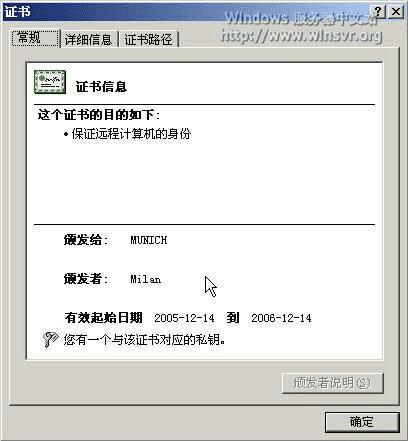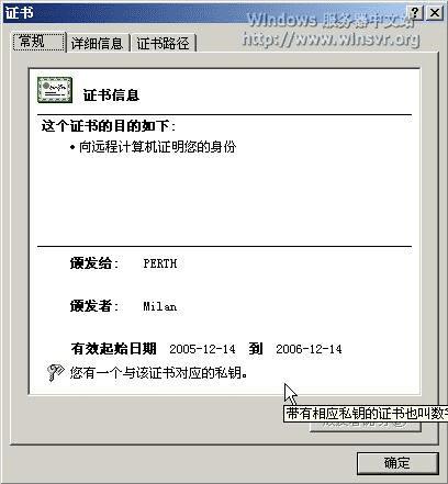 双击此证书,弹出证书属性对话框,如下图所示。至此VPN服务器上的证书安装完成,VPN服务器已经可以使用此服务器身份验证证书来验证VPN客户端的L2TP/IPSec VPN连接了。