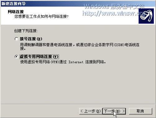 在网络连接页,选择虚拟专用网络连接,然后点击下一步;