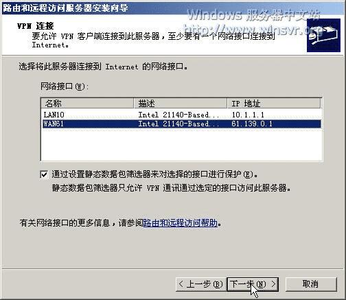 在VPN连接页,选择连接到Internet的网络接口,在此我选择对应的接口WAN61,默认情况下,RRAS会设置通过设置静态数据包筛选器来对选择的接口进行保护,这将在此接口上启用只是允许VPN流量的入站筛选器(关于入站筛选器更详细的描述,请参见深入理解路由和远程访问服务中的筛选器和基本防火墙一文),从而保护这台VPN服务器。根据你的需要来决定是否启用此选项,在此我接受默认设置,点击下一步;