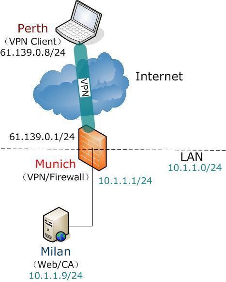 这篇文章的试验环境如下图所示,Internet上的VPN客户端Perth(IP地址为61.139.0.8)将通过Munich(外部IP地址为61.139.0.1,内部IP地址为10.1.1.1)上的VPN服务连接到内部网络(10.1.1.0/24)中。Milan是内部网络上的Web服务器和证书服务器,IP地址为10.1.1.9。所有计算机的操作系统均为Windows Server 2003 SP1,并且均为独立服务器,在进行试验之前已经确保网络连接工作正常。