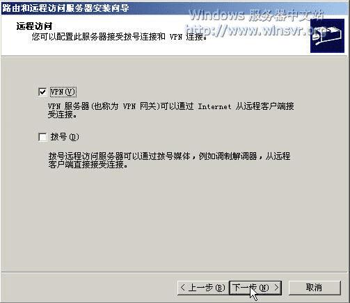 在远程访问页,选择此服务器接受的远程访问类型,在此我仅勾选VPN,然后点击下一步;