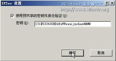 在弹出的IPSec设置对话框上,勾选使用预共享的密钥作身份验证,输入和VPN服务器上配置使用的相同密钥,点击确定。