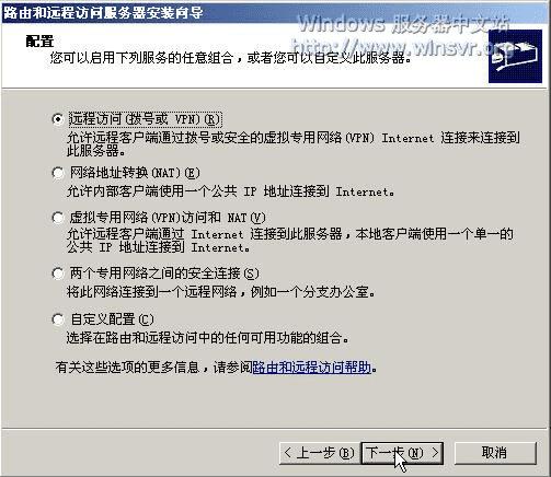 在配置页,选择远程访问(拨号或VPN),然后点击下一步;如果你需要对内部网络提供网络共享服务,则选择虚拟专用网络(VPN)访问和NAT,再根据向导进行配置;