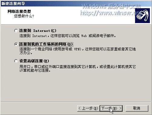 在网络连接类型页,选择连接到我的工作场所的网络,然后点击下一步;