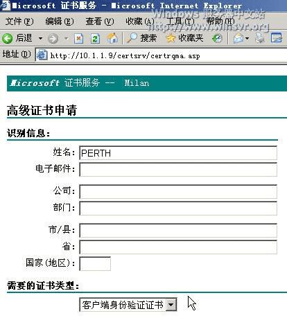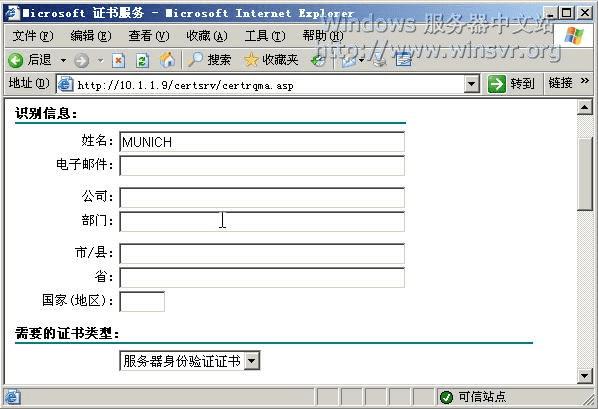 在高级证书申请页,在姓名栏输入计算机名MUNICH,注意,千万不能输错;在证书类型栏,选择服务器身份验证证书;