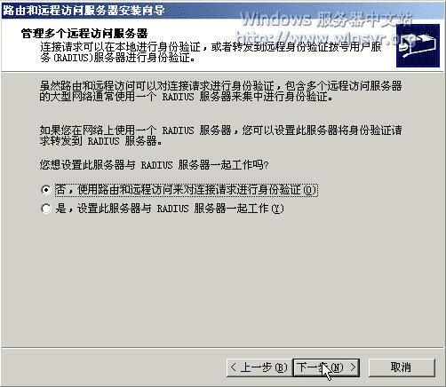在管理多个远程访问服务器页,由于在此我不使用RADIUS服务器,所以接受默认的否,然后点击下一步;